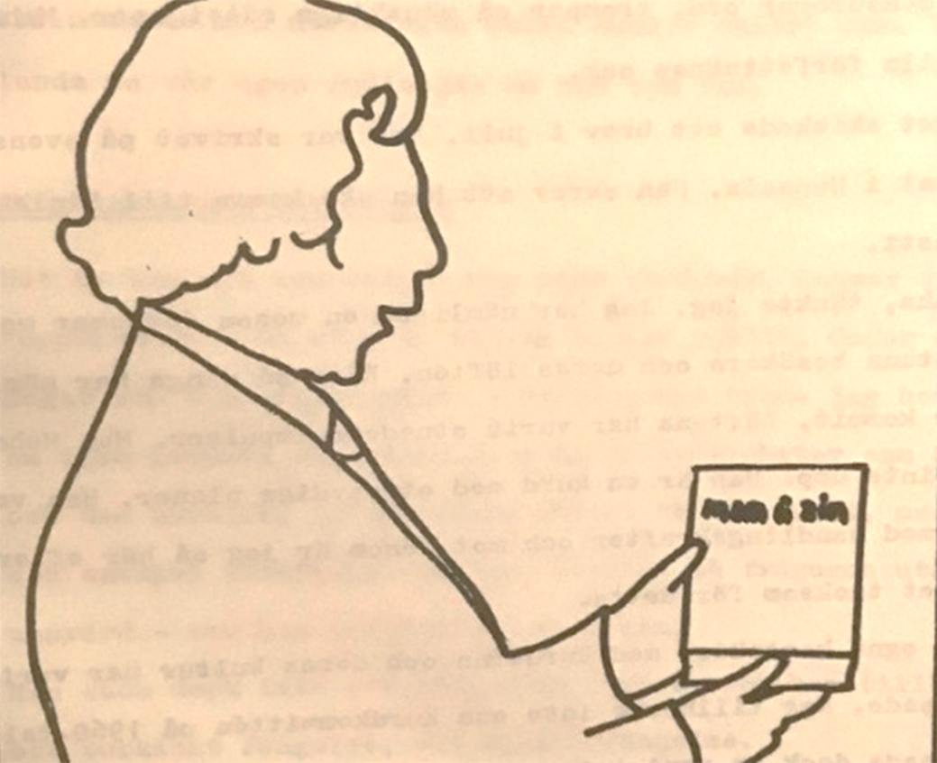 Karîkatûrê Bozarslan, di destên wî de pirtûka Mem û Zîn (Näköpiiri, nr 11/1980)